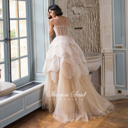 Luxury Dubai Champagne High Low Evening Dress 2022 Elegant Tiered Ruffles Short Front Long Back Arabic Prom Party Dresses SS249