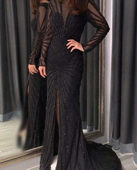 Luxury Black Mermaid Long Sleeve Arabic Evening Dress for Women Party Formal Dresses Front Split Dubai Graduation Prom Dress