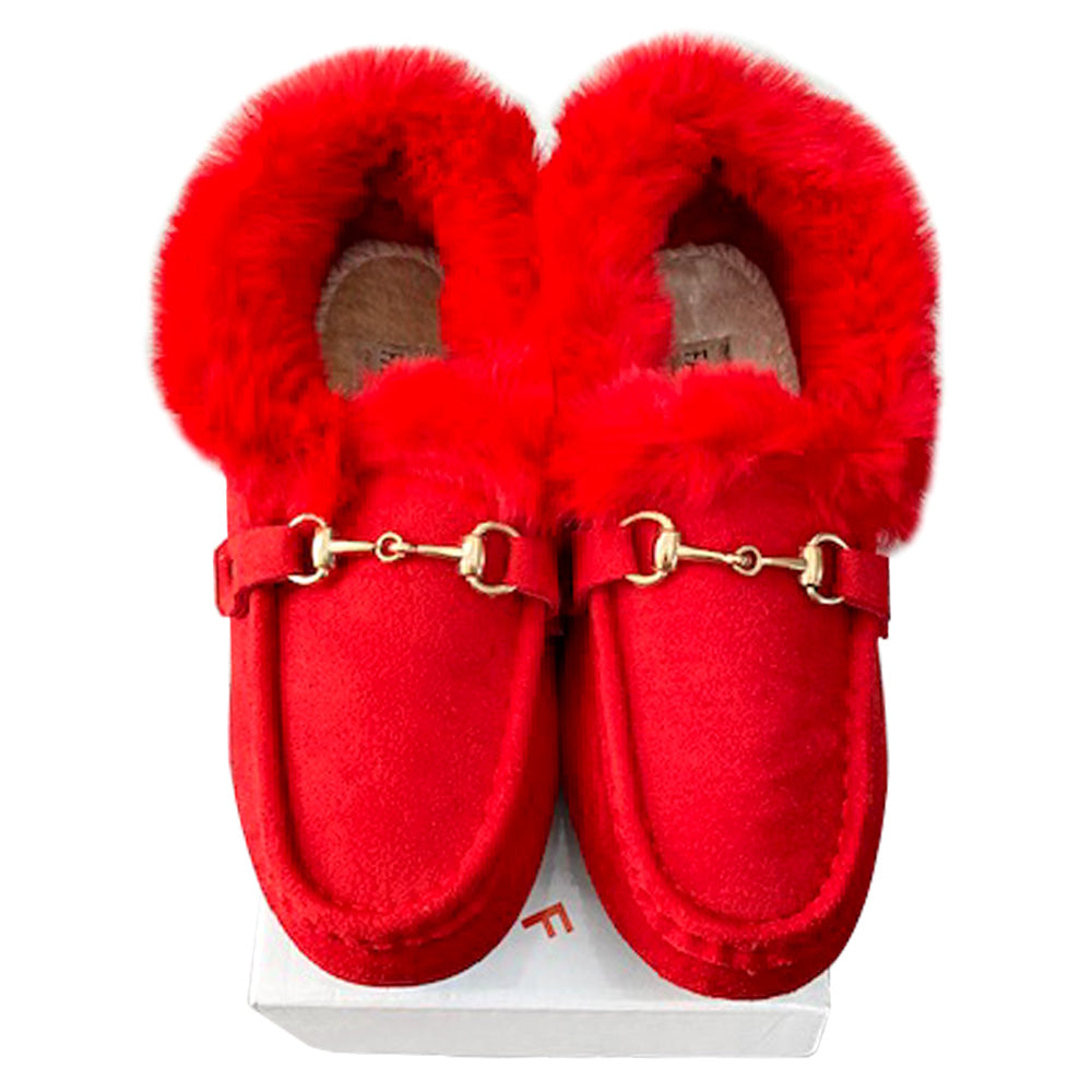 • Women’s Faux Fur Lined Suede Loafers – Cozy Winter Slip-On Shoes with Gold Hardware