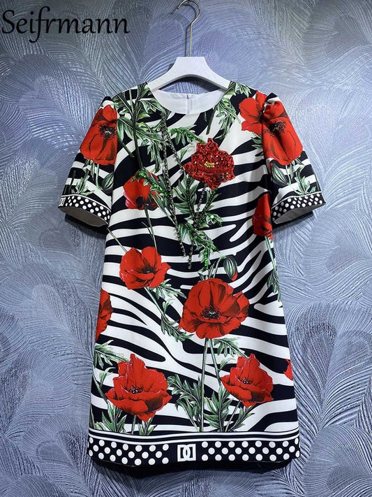 Seifrmann High Quality Summer Women Fashion Runway Mini Dress Short Sleeve Beading Striped Floral Printed Elegant A-Line Dresses