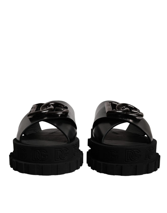 Dolce & Gabbana Black Leather DG Criss Cross Slides Sandals Shoes