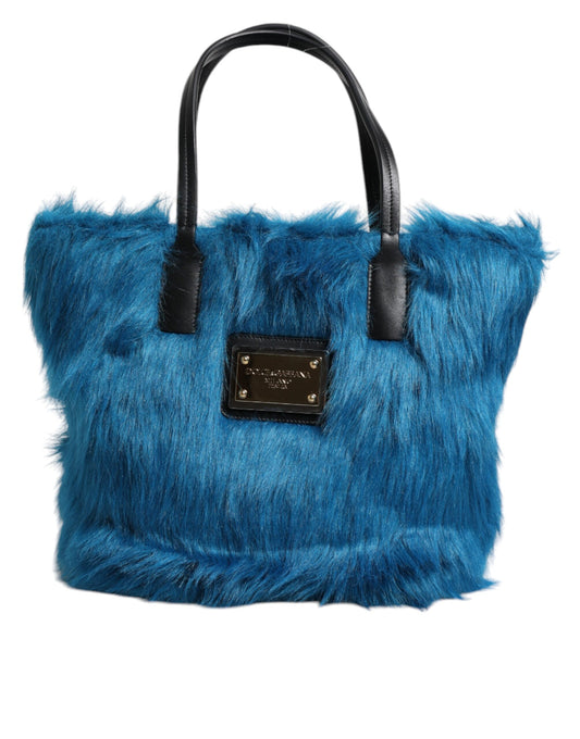 Dolce & Gabbana Blue Fur Logo Plaque Double Handle Shoulder Bag