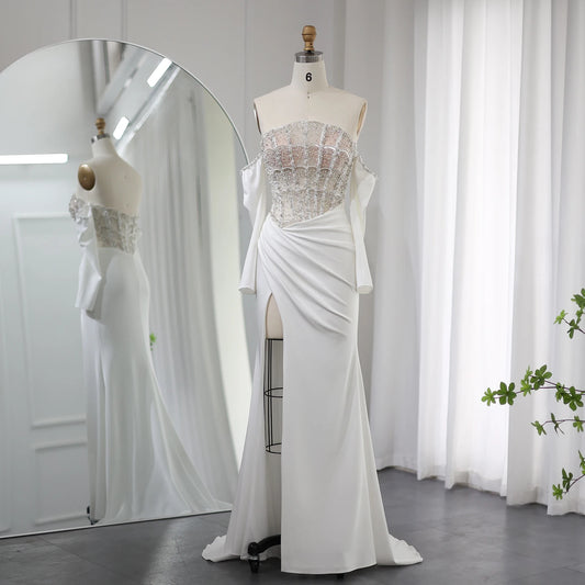 Sharon Said Luxury Dubai Mermaid White Evening Dress 2023 Sexy Scalloped High Slit Prom Dresses for Women Wedding Party SS416