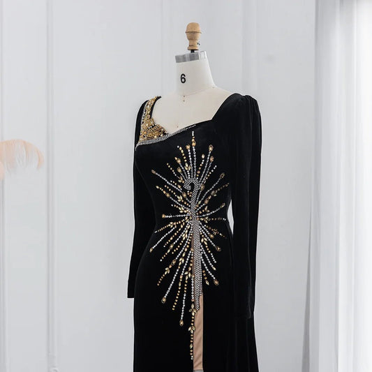 Sharon Said Luxury Crystal Black Velvet Dubai Evening Dresses with Overskirt Long Sleeve Formal Party Dress for Wedding SS533