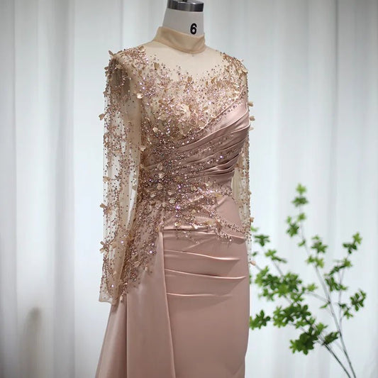 Sharon Said Rose Gold Mermaid Arabic Evening Dresses Long Sleeve Luxury Dubai Muslim Formal Dress for Women Wedding Party SS472