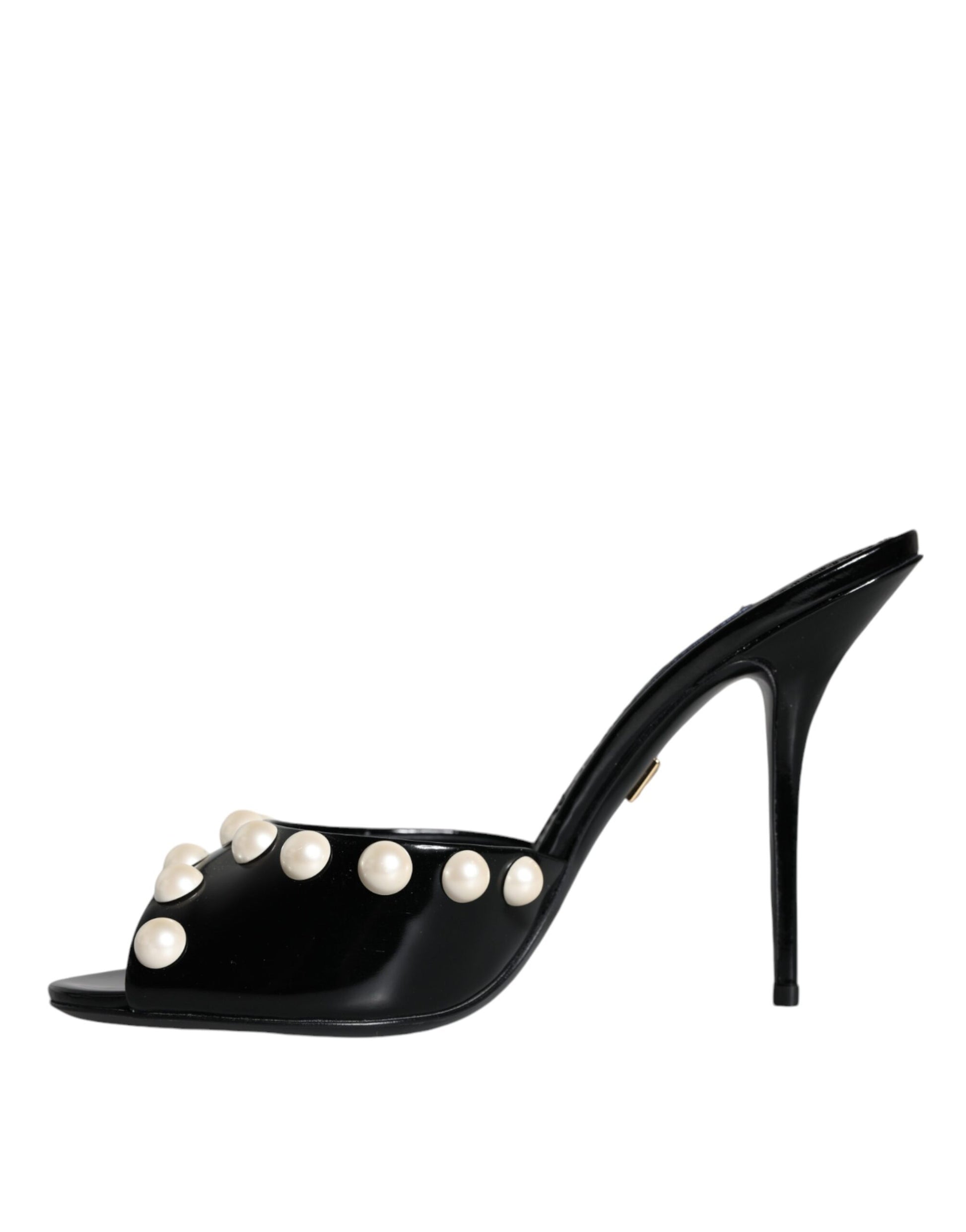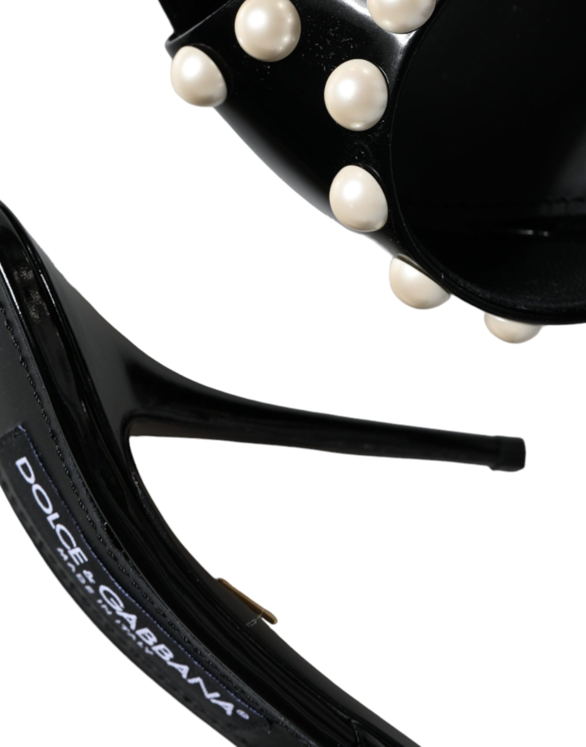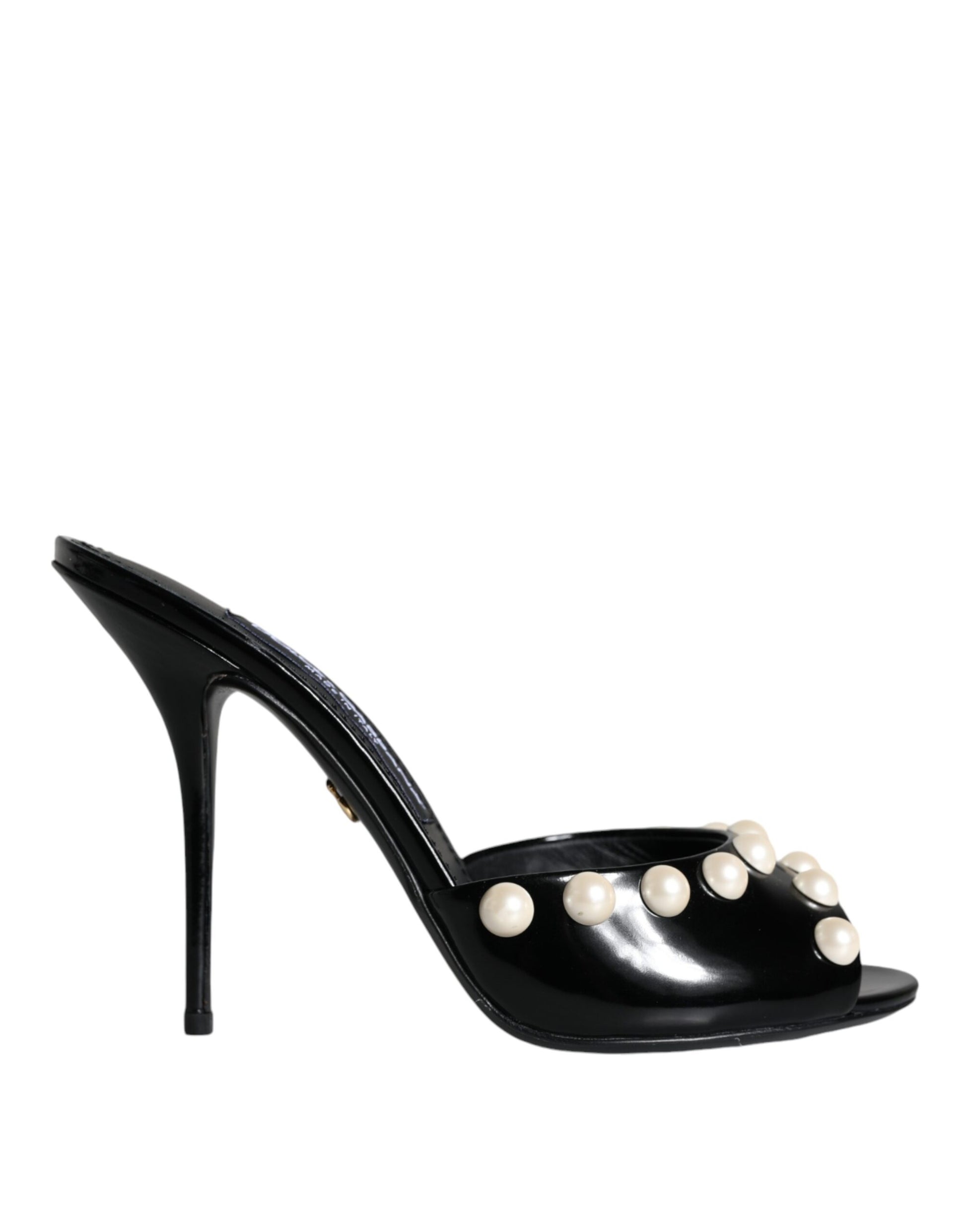 Dolce & Gabbana Black Leather Pearls Slides Sandals Shoes