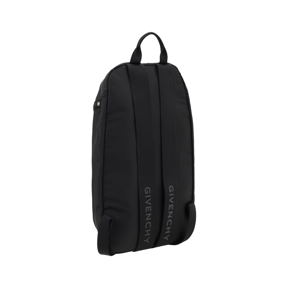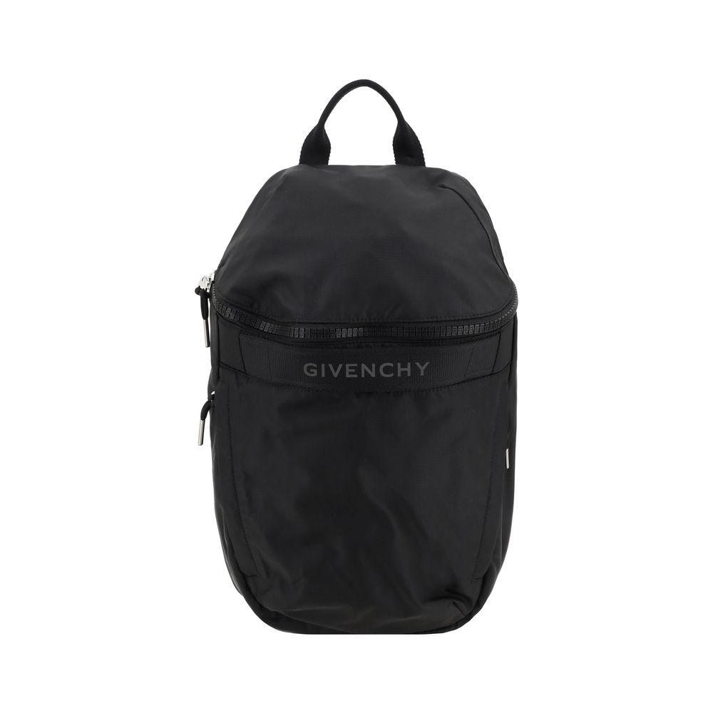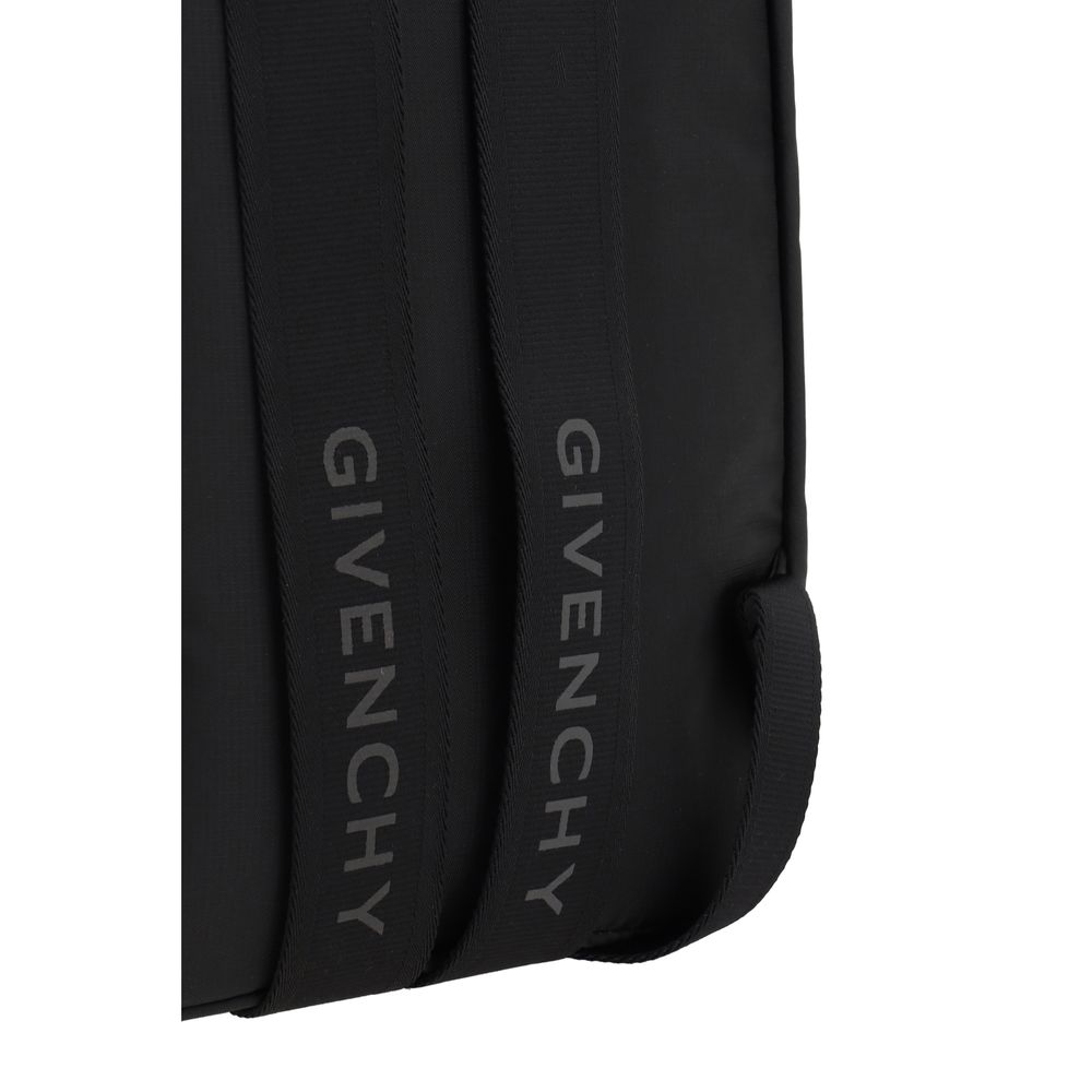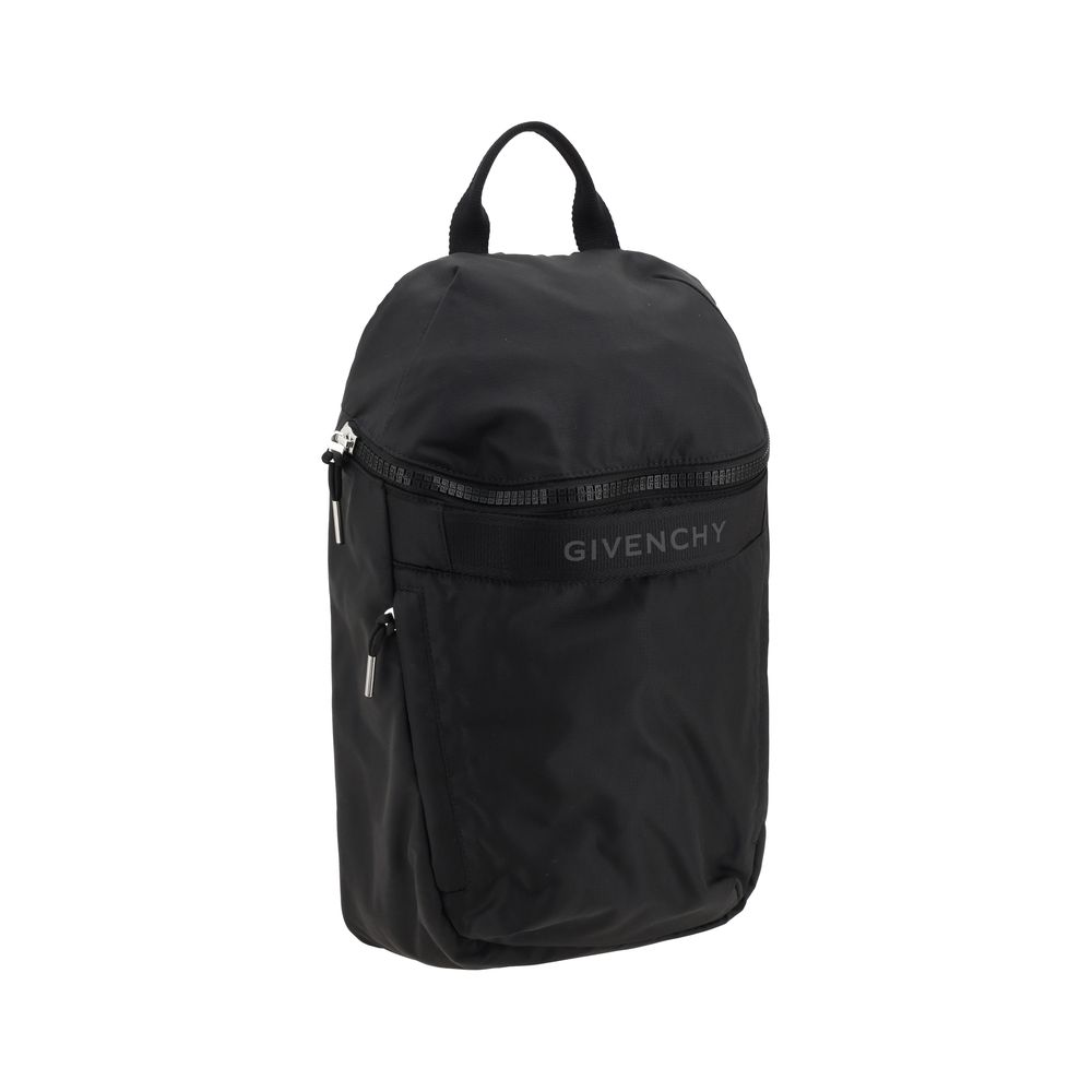 G-Trek Backpack by Givenchy, top handle, flap and zipper closure on front, adjustable webing shoulder straps with iconic reflective brand signature, two zippered side pockets, main interior compartment and one reinforced pocket for storing computer, webing band with reflective brand signature on front.